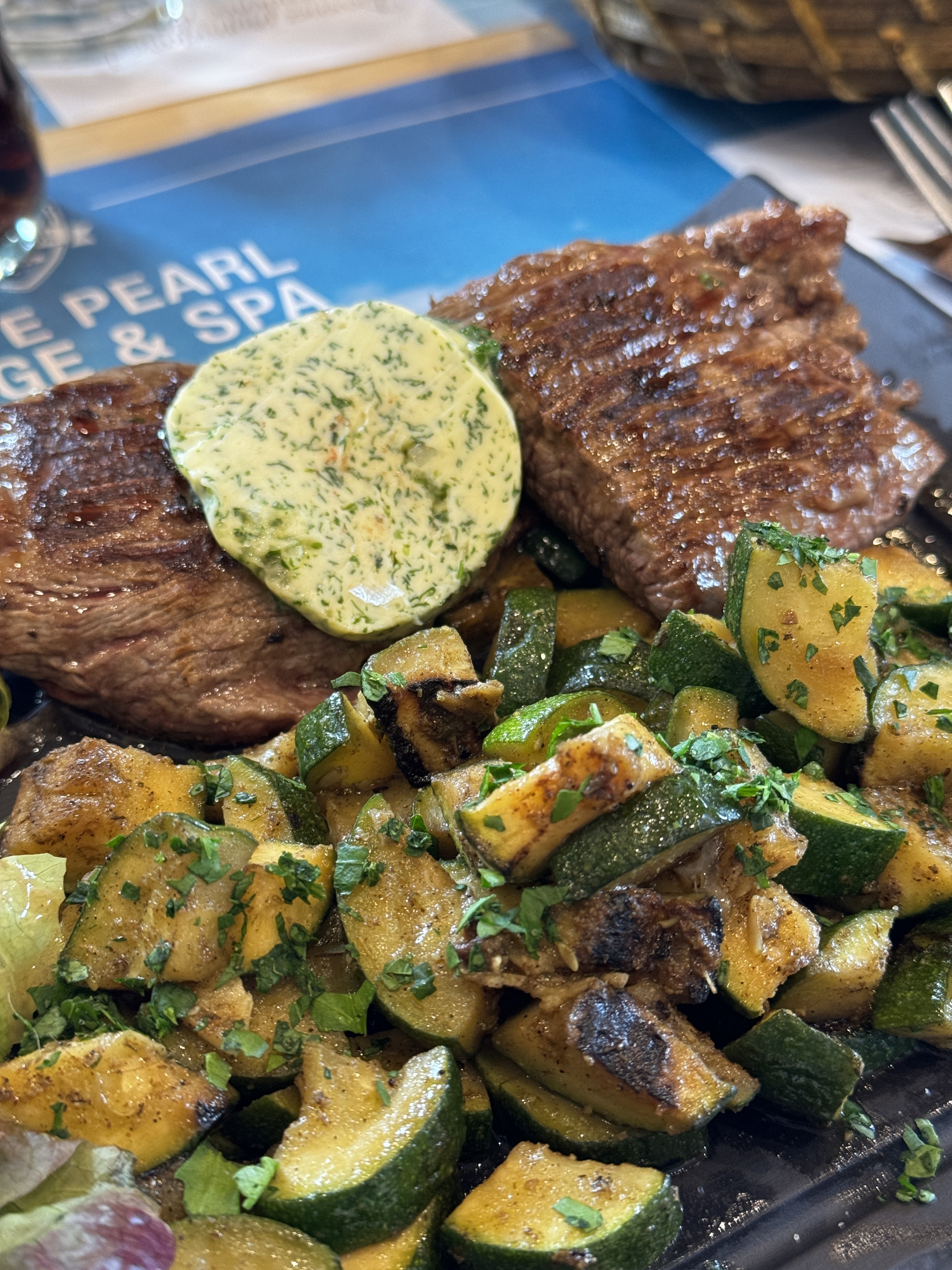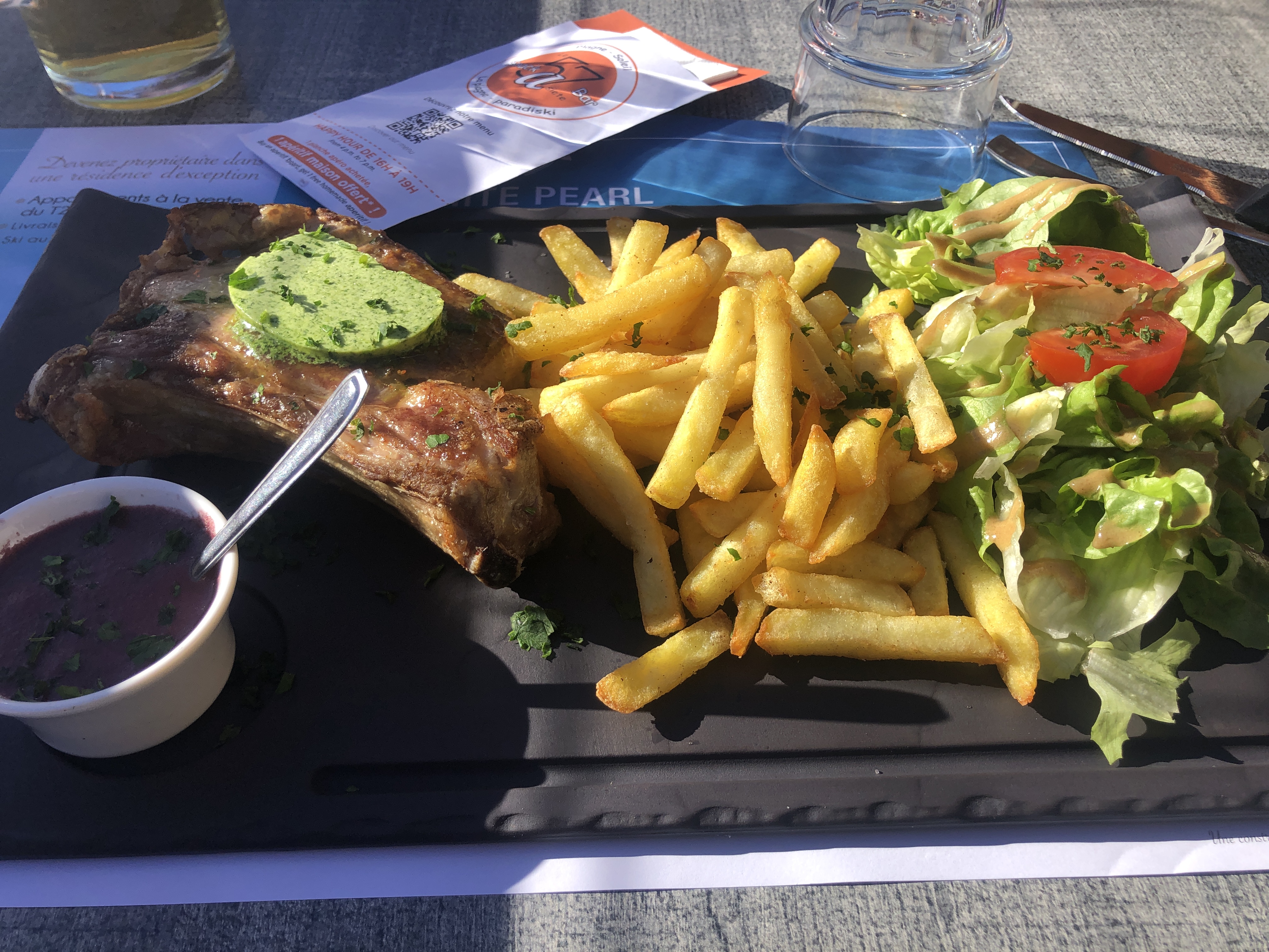 Je vais au restaurant à Plagne Soleil pour un repas relaxant et confortable. Parfait également pour un verre après le ski ! Ce restaurant est bien situé sur la place principale du village de Plagne Soleil. Il y a une grande terrasse et un espace intérieur avec des tables de 4 à 8 personnes. Pratique pour les groupes et les grandes familles. La carte des plats est simple, savoureuse et pas trop chère pour un restaurant d'altitude. Nous avons commandé une salade plus que généreuse, le steak de bœuf juteux et bien cuit et les filets de poulet croquants et juteux à l'intérieur. Jamais déçu de cet endroit ! Continue.